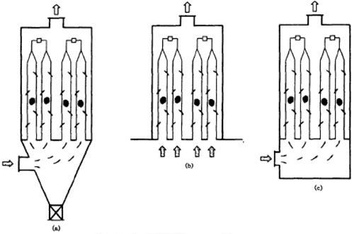 濾袋一般采用729滌綸除塵布袋或滌綸針刺氈,縫制成三袋聯(lián)體袋(也稱三聯(lián)袋),底部縫有彈性環(huán)使其能直接卡入花板孔中,頂部縫有相同材料的掛帶使其能將濾袋張緊和吊掛在搖桿上(見(jiàn)圖7-3)。過(guò)濾形式為內(nèi)濾式。工作時(shí)含塵氣體由濾袋下口進(jìn)入內(nèi)部;過(guò)濾后的清潔氣體經(jīng)袋室由排風(fēng)機(jī)排入大氣,清灰時(shí)先停止過(guò)濾工作,再啟動(dòng)搖動(dòng)清灰機(jī)構(gòu)進(jìn)行清灰。