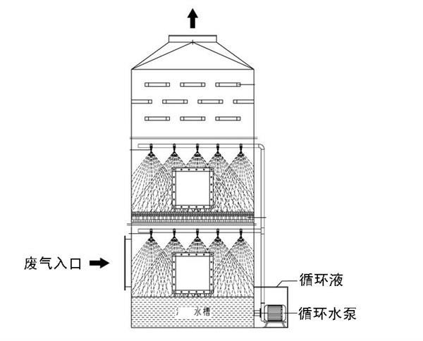 噴淋洗滌工藝對于各種腐蝕性氣體凈化處理效果明顯,能有效去除氯化氫氣體(HCl)、氟化氫氣體(HF)、氨氣(NH3)、硫酸霧(H2SO4)、鉻酸霧(CrO3)、氰氫酸氣體(HCN)、堿蒸氣(NaOH)、硫化氫氣體(H2S)、福爾馬林(HCHO)等水溶性氣體。