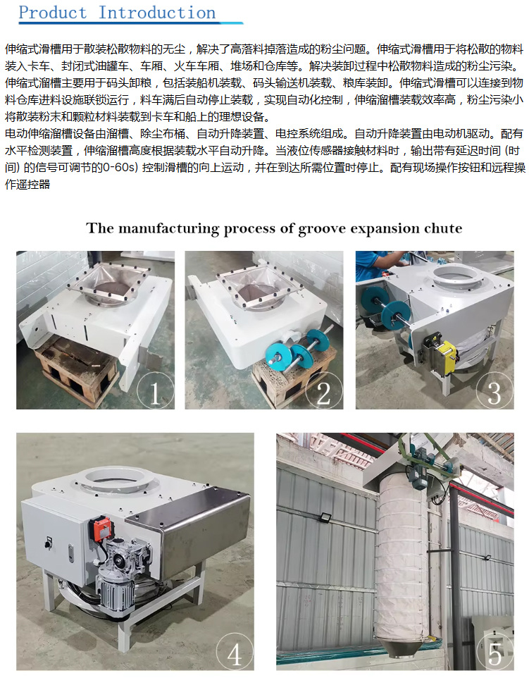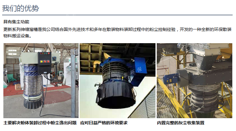 服務電話:13091153069(同微信)伸縮式卸料管是一種物料處理設備,用于將粉末和干散狀物料無塵地裝入或卸入容器、卡車和船只。它是一種自動化且靈活的解決方案,可以根據不同行業(yè)的需求進行定制。伸縮式卸料管系統(tǒng)的主要功能是通過垂直的鐵管利用物料自身的重量排放粉末或顆粒狀散裝固體,同時通過外層的一層帆布材料的布筒收集卸料時產生的粉塵。為了適應上部排放點和下部裝載點之間的不同高度,鐵管被設計為可伸縮的。鐵管的靈活性是伸縮式卸料管系統(tǒng)的關鍵特性,它允許根據不同的排放和裝載點進行調整,使其成為廣泛應用的多功能解決方案。