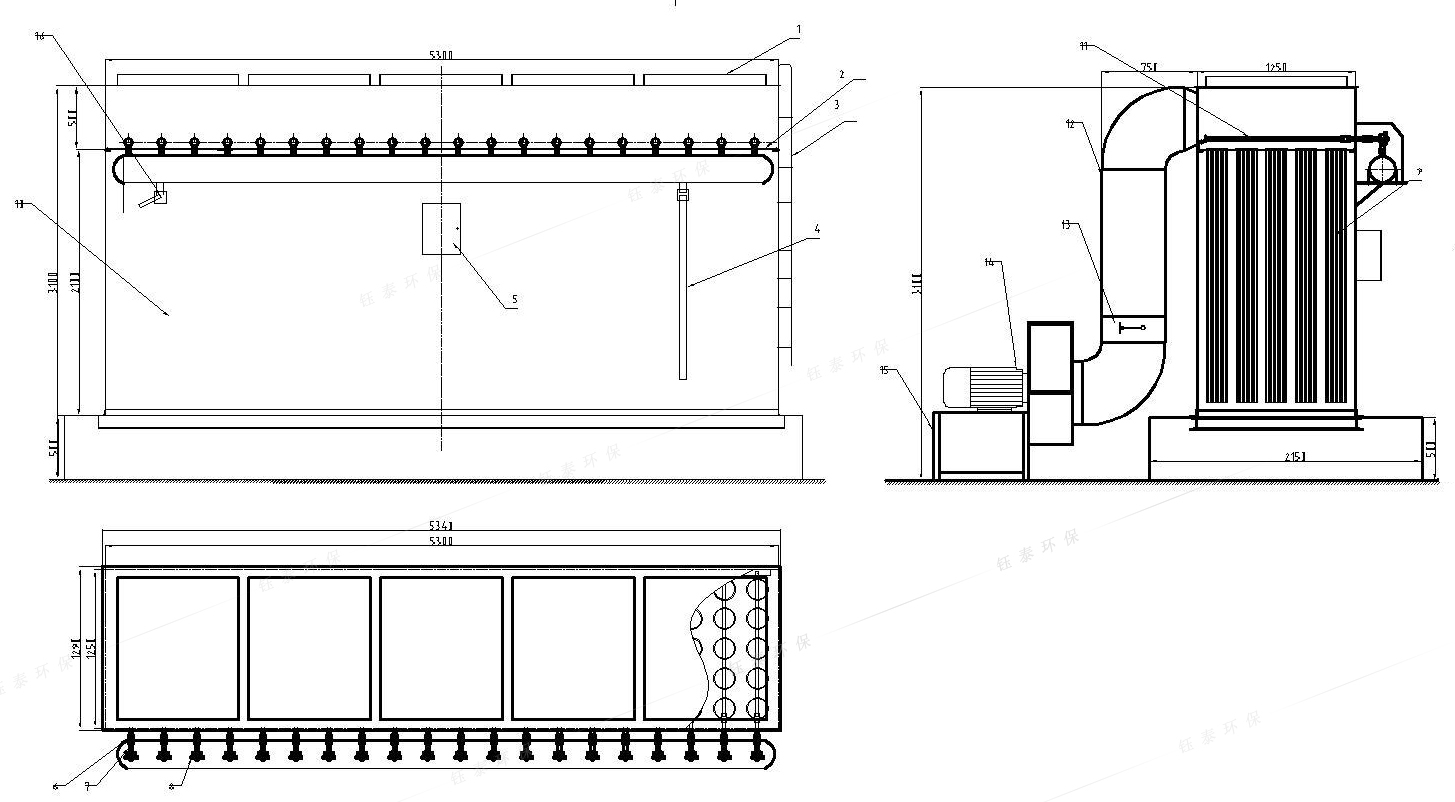 改造后,灰?guī)斓拿繂闻_(tái)庫(kù)頂布袋除塵器技術(shù)參數(shù):處理風(fēng)量17000m3/h、過濾風(fēng)速1.0m/min、過濾面積240m2,濾袋耐溫135℃、抽塵風(fēng)機(jī)出口含塵濃度≤10mg/Nm3。除塵器外型尺寸為原除塵器外殼尺寸:5.3×1.25×3.1m(高)